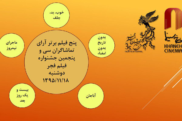 به گزارش پایگاه خبری تحلیلی فناوری و نوآوری، نتیجه شمارش آرای فیلم های نمایش داده شده در روز هشتم جشنواره فیلم فجر ( ۱۳۹۵/۱۱/۱۸) توسط ستاد انتخاب فیلم برگزیده از نگاه تماشاگران جشنواره فیلم فجر اعلام شد. فهرست فیلم ها بدون اولویت به شرح زیر است:
